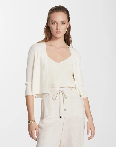 Throw this adorable cardigan over any cami or tank top.Chic essential crafted from the brand's signature Finespun Voile yarns. Offers an unparalleled combination of softness and lightweight comfort. Open-front design and collarless neckline offer an effortlessly sophisticated look. Cropped, fitted silhouette. Below-the-elbow sleeves. Subtle Cloud color provides a versatile backdrop for both casual and more polished outfits. Made from a delicate blend of Lyocell, Nylon, and Silk. Ensures both elegance and durability. Promises to be a timeless addition to your collection, providing a refined and luxurious touch to any outfit.