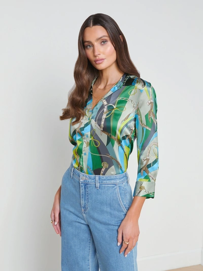 L'AGENCE Dani Belt Swirl Printed Silk Blouse In Sea Green