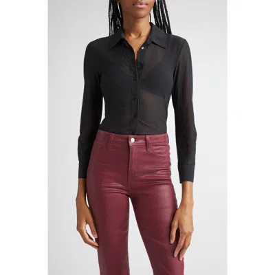 Cut from semisheer fabric this polished day-to-night shirt is kissed with stretch for a close fit. Front button closure Spread collar Long sleeves with button cuffs 90% nylon, 10% spandex Dry clean Imported