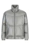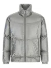 Metallic shield nylon down jacket with quilted titanium coating and goose feather padding, standing collar, front zip closure, pockets, long sleeves with elastic cuffs and dropped shoulder, drawstring on the hem. SUSTAINABLE: Product made from recycled polyester.. Colour. : Silver. Composition. : 100% polyamide. Country Of Manufacture. : Italy. Dimension. : Relaxed fit. MPN. : PI00372UL128499500. .