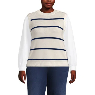 LANDS' END Plus Size Drifter Shaker Button Shoulder Sweater Vest With Poplin Sleeves In Fresh Ivory/navy Stripe