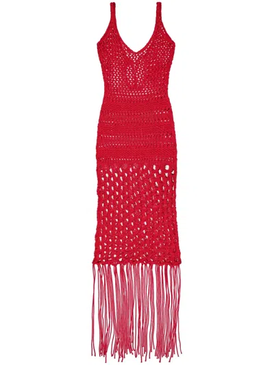in red polyester, round neck, frayed edges, thin straps, perfored, 54% Cotton, 30% polyester, 16% polyamide, Made in Italy, model is 180 cm and wears size 40