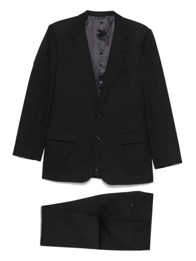 circa 2000s navy blue cotton front button fastening notched lapels chest welt pocket dart detailing two front flap pockets long sleeves buttoned cuffs English rear vents concealed fly and button fastening belt loops two diagonal pockets to the sides pressed crease two rear button-fastening jetted pockets