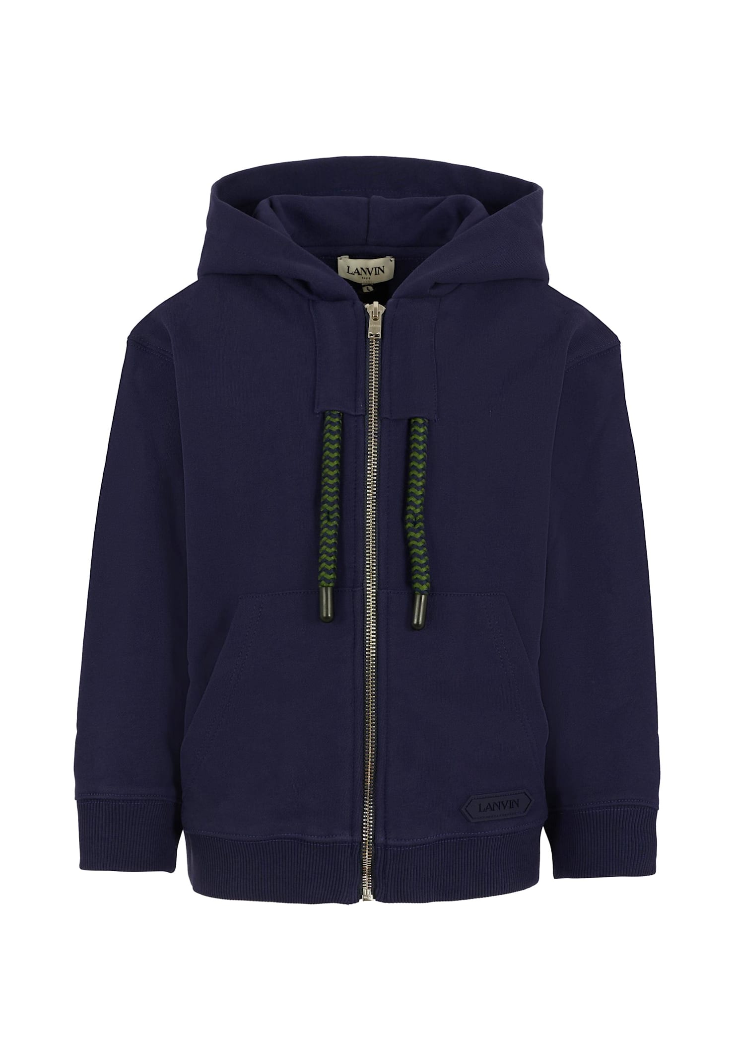 Color: Blue Blue sweatshirt from the Lanvin Petite brand, made of organic brushed cotton, with long sleeves, new tubular Curb laces, called Snake, practical side pockets, ribbed cuffs and hem, front zip for a comfortable fit. It is embellished with Lanvin logo embroidered on the hood and rubber logo on the front. 100% Cotton. Machine wash at 30°C.