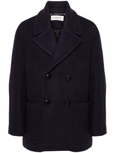 navy blue virgin wool felted double-breasted button fastening wide notch lapels shoulder pads long sleeves two chest welt pockets two side patch pockets Italian rear vents quilted lining straight hem