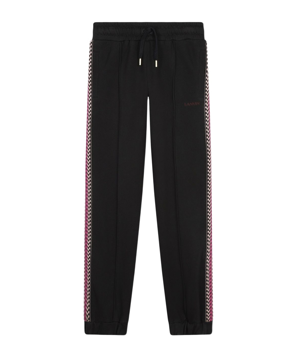 elasticated waist with drawstringelasticized bottomtwo side pocketsmulticolored "curb" pattern side bandscontrasting "lanvin" embroidered lettering on the frontsporty designregular fitcolor: black100% cottonmade in bulgaria