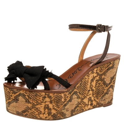 Pre-owned Metallic/black Canvas And Leather Bow Python Print Platform Wedge Sandals Size 39