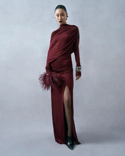 Jersey Asymmetrical Shawl Draped Gown In Red