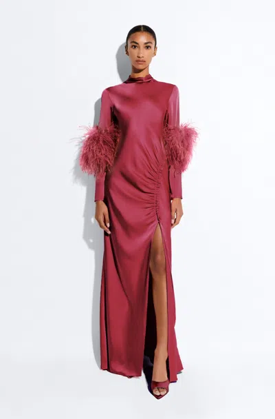 Draped neck gown in our luxurious doubleface satin with feathers on sleeves. Features a shirred tab for adjustable coverage and zipper at center back. Materials: 61% Acetate, 39% Viscose Trim: 100% Real Ostrich Feather; Dyed Ostrich Feather, Struthio Camelus, Republic of South Africa Fit: This style is cut on the bias and has a naturally looser drape. Size down if you’re between sizes or prefer a more fitted silhouette Care: Clean by Fur Specialist Only Model is 5'10 and wearing a size 2