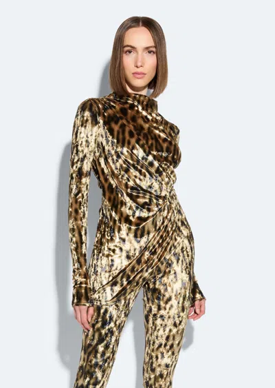 This Stretch Velvet Leopard Print Long Top features all over draped details and an asymmetric hem. Material: 96% Polyester, 4% Elastane Care: Machine Wash Cold Fit: Relaxed Fit. True To Size.