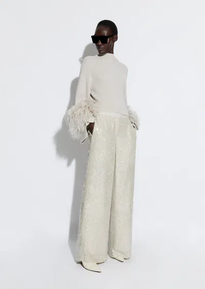 Fabric: Heavyweight shaker knit. Ostrich feather trim. Turtleneck. Long sleeves with split cuffs. Shell: 100% merino wool. Trim: 100% feathers. Dry clean. Imported, China. Measurements: Measurements from size XS Length: 18in / 46.0cm, from shoulder