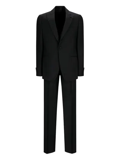 black single button fastening peak lapel flower lapel pin straight trousers cotton