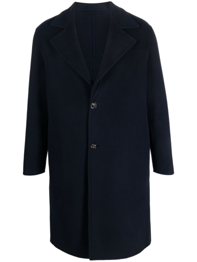 single-breasted wool-blend coat from LARDINI featuring midnight blue, wool-cashmere blend, vertical seamed, notched lapels, front button fastening, long sleeves, central rear vent and straight hem.