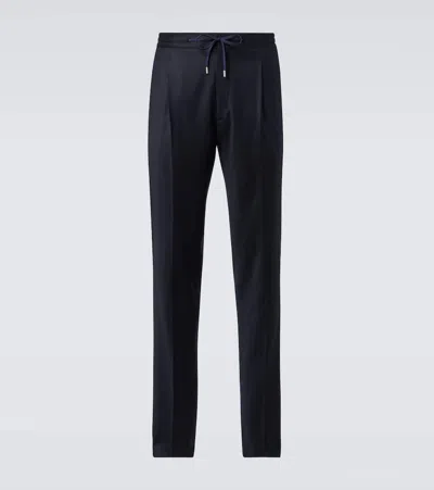 Material: 89% wool, 10% cashmere, 1% elastane. Care instructions: dry clean. Made in Italy. Designer color name: Navy. Item color: blue. Lining: 100% viscose. Elasticated drawstring waist. Closure: zipper, hook fastening. Pockets: side slit pockets, back pockets. Hem: unfinished (ready for alteration). Wool, Cashmere.