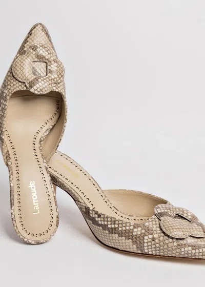 Pair these beauties with your favorite skinny jeans or dress for a night out on the town.Elevate your style with the Flora Pump by Larroude, featuring a stunning light python leather composition for a snakeskin effect that's both sleek and chic. With a 2.5-inch stiletto heel, these pumps are designed with a finely crafted leather sole for superior support, durability, and comfort. Perfect for pairing with both denim and menswear-inspired suits, these pointy-toe heels add a ladylike touch to any ensemble. Ideal for women seeking a mid-heel height, they'll effortlessly become an indispensable part of your everyday wardrobe.