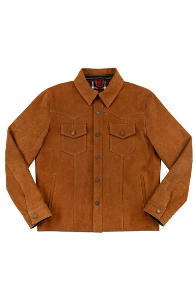 Cowhide suede trucker jacket Trucker Jackets revive the spirit of the west, the hard work in the fields, and the outdoors living in the Midwest. We translated all that in our Sequoia Trucker Jacket with western yokes in the front chest and top back. Two flap pockets on the chest, as trucker jackets are meant to be. Water-resistant cowhide suede leather. Lastwolf® antique brass snaps closure. Contrasting lamb leather on the neck, cuffs, and pocket flaps. Adjustable cuffs closure with two metal snaps. Two welt side comfort pockets. Two chest flap pockets with safety metal snaps. Two inside roomy safety pocket holds a cell or a wallet. 100% cotton lining.