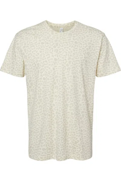 4.5 oz./yd, 100% combed ringspun cotton fine jersey, 30 singles. Ash is 99/1 combed ringspun cotton/polyester. Heather is 90/10 combed ringspun cotton/polyester. Bermuda Black, Black Leopard, Blended Black, Blended White, Cardinal Blackout, Granite Heather, Ice Blackout, Sangria Blackout, Storm Camo, Surf Blackout, All Vintage Colors & Wisteria Blackout are 60/40 combed ringspun cotton/polyester. Ash and White are sewn with 100% cotton thread. Topstitched ribbed knit collar. Shoulder-to-shoulder self-fabric back neck tape. Double needle sleeves and bottom hem. Side seams. EasyTear label.