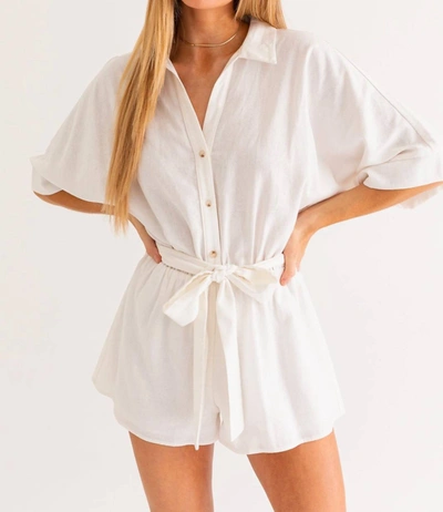 It doesn't take much for this one piece to look effortlessly cool. Add some statement jewelry to dress it up, or throw on some sneakers for a more casual vibe.Off white collared romper with tie closure. Button front detail. Wide sleeve.