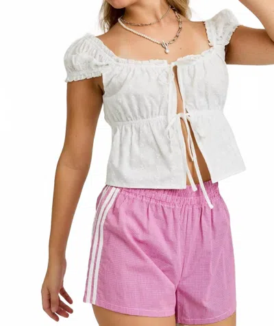 A timeless blouse that will never go out of style.Enhance your wardrobe with the Elena Eyelet Blouse by LE LIS, perfect for adding a playful touch to any outfit. This white cotton blouse features short cap sleeves and a chic square neckline, with a charming tie closure and textured eyelet details. It's ideally suited for summer occasions or a minimalistic vacation vibe. Care for this stylish piece is easy with its machine wash compatibility.
