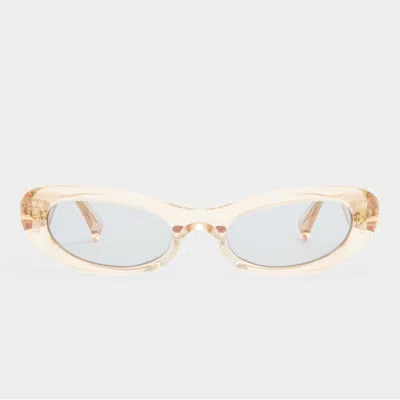 With considered curves and narrow proportions, our NUMERO UNO oval silhouette sunglasses offer a sleef and refined look. Made from bespoke custom 8mm & 6mm acetates, this frame highlights delicate chamfering detail meticulously added to every aspect of the frame, providing a soft and rounded luxurious, hand polished look and feel. Each pair is finished with Le Specs signature three dimensionally crafted Infinity flagstripe metal decal and iconic single flagstripe inspired rounded rivet offering an unparallel level of sophistication. • Finished in a luxurious translucent nude acetate and light gray tinted lenses. • Carefully crafted from handmade cellulose acetate with a luxurious touch and comfortable fit. • Fitted with premium CR-39 lenses which offer superior optical clarity, and provide 100% UVA / UVB protection. • Packaged with Le Specs Luxe premium protective magnetic closure case with gold foil fill logo and branded microfiber cleaning cloth.