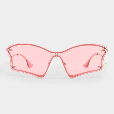 Featuring a sweeping mask aesthetic and fluid lines, our NYMPH shield sunglasses exude a futuristic allure. Featuring bottom feeding style curved metal temples and distinctive flared tip shape, these frames offer a petite fit and are finished with adjustable nose pads. • Finished in a shiny bright silver frame with light pink tinted lenses. • Sturdy metal frame fitted with allergy-free cushioned PVC nose pads. • Fitted with shatterproof and scratch resistant polycarbonate lenses.