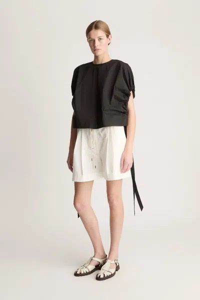 60% Cotton, 40% Nylon. Fixed waistband with zip closure and cord tie. Tuck front detailing. Side pockets.