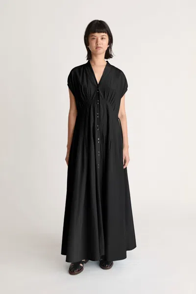 54% Silk, 46% Cotton. Scoop neckline with button through front. Gathered skirt with tucks and waist tie. Maxi length.