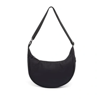 Half moon bag with zippered closure. It features an inner zipped pocket to keep your smaller items accesible. Ajustable cotton webbing straps. - Water-resistant Recycled PET fabric. - Metal Hook fastening for extra security. - Anti-theft back pocket. - 5-year warranty. - Machine washable with cold water - Imported