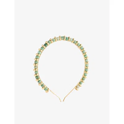 Lelet Ny "Xenia" headband is where soft elegance meets natural beauty. Handstrung with semiprecious stones and polished metal accents, each piece is thoughtfully crafted to add subtle impact to your look. Made of spotted jade and brass with a goldtone finish Wipe clean Imported