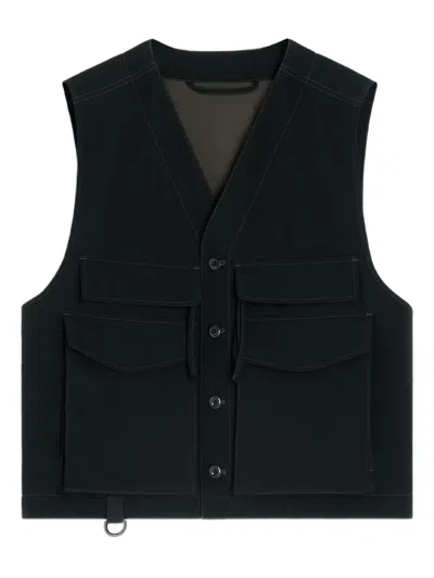 In sleek black, the Utility Gilet embodies a refined workwear aesthetic. Tailored from lightweight wool twill with contrast topstitching, it features a v-neck, button closure, and multiple chest zipped and side flap pockets for functional appeal. Accented with a front metal D-ring and a straight hem, this sleeveless design merges precision tailoring with utilitarian style.