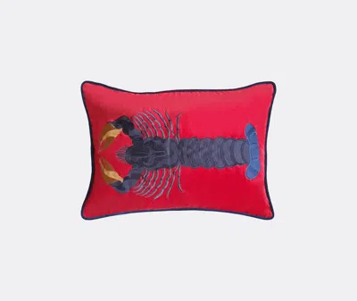 Lobster-embroidered linen cushion from Les-Ottomans featuring rose red, multicolour, linen, embroidered motif and rectangle shape. This item contains at least 50% materials which are certified or widely recognised as having a lower environmental impact through production and/or manufacturing processes that reduce water consumption and the use of harmful chemicals, or re-use by-products of the production process.. Learn more about what makes a product Conscious on our Conscious Criteria page.