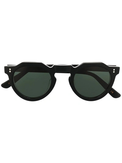 Black round frame sunglasses from LESCA featuring round frame, straight arms and green tinted lenses.