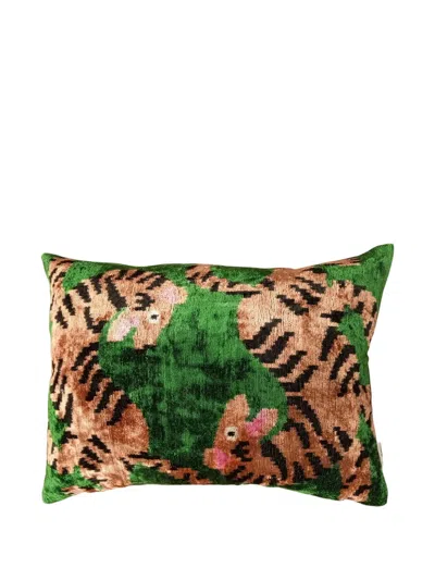 Introducing a warm opulence to spaces, Les Ottomans' collection of silk velvet cushions reflects the Italian brand's reverence for traditional pattern and technique. The surface design of this artisanal piece, which appears in rich multicolor shades of green, gold, black and pink, features two stylized, open-mouthed tigers facing in opposite directions. Playful, with a far-flung feel, this sumptuous interior accent can be mixed and matched with other cushions from the series for a lively display.