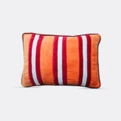 Les Ottomans' collection of velvet cushions brings a colorful decadence to spaces. This artisanal cushion design features three red stripes, layered with white, on a cool orange background. Double-sided and finished with silk edging, this luxurious interior accent can be mixed and matched with other designs by the Italian brand for a bold and lively display.