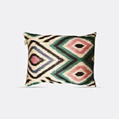 Introducing a cool opulence to spaces, Les Ottomans' collection of silk velvet cushions reflects the Italian brand's reverence for traditional pattern and technique. The surface design of this artisanal ikat cushion features a dynamic diamond pattern, with subtle eye motifs. Appearing in multicolor tones of pink, green and blue, this striking interior accent can be mixed and matched with other cushions from the series for a vivid display.