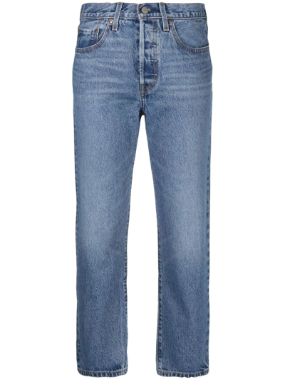501 cropped straight-leg jeans from levis featuring blue cotton logo patch to the rear whiskering effect at the thighs belt loops button fly fastening cropped leg and classic five pockets size jeans