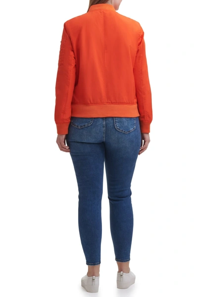 Bring a cool, sporty vibe to your look with a bomber jacket in a perfectly loose shape featuring a trio of zip pockets for all your essentials. True to size. 1X=14W-16W, 2X=18W-20W, 3X=22W-24W. 29 1/2" length (size 2X). Front zip closure. Blade collar. Long sleeves. Front zip pockets; on-sleeve zip and penholder pocket. Rib-knit collar, cuffs and hem. Lined. 100% polyester. Machine wash, tumble dry. Imported. Coats
