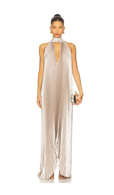 L'IDEE Opera Gown in Metallic Silver. Size 10/M, 12/L, 14/XL, 8/S. 100% polyester. Hand wash cold. Unlined. Halter self-tie closure. Metallic sheen. Front cut-out accent. Midweight plisse fabric. LIDR-WD187. OPERA GOWN.