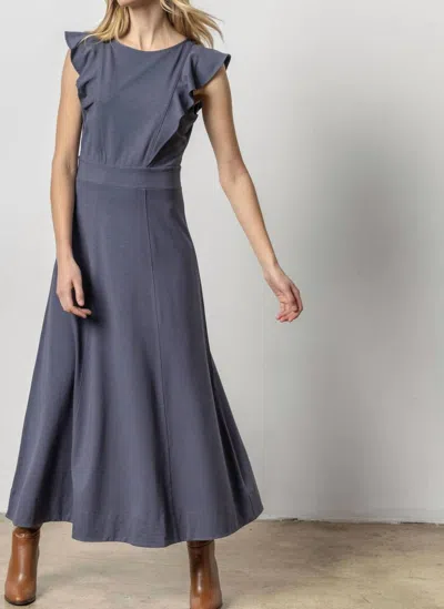 Who doesn't love a good maxi dress? This one you'll be reaching for season after season.Elevate your wardrobe with the Odyssey Flounce Trim Maxi Dress by Lilla P, crafted from a stretchy cotton blend that contours to your shape beautifully. This sleeveless dress features a flattering A-line silhouette with a ruffled detail for added charm. With a pull-on closure, this 53.5-inch long garment in a dark steel gray-blue hue makes it perfect for any occasion. Embrace the versatility of this solid-hued piece, effortlessly transitioning from day to night.