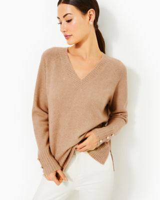 Wear this v-neck sweater with your favorite denim for the perfect fall look.Embrace the season with the Kaycee Sequin Sweater by Lilly Pulitzer, a perfect blend of comfort and sparkle. This long sleeve, v-neck sweater boasts a stepped hem and side slits, adorned with rhinestone buttons at the cuffs. The composition of this piece includes 60% Acrylic, 36% Polyester, and 4% Lycra, offering an easy, yet roomier fit. Measuring 25 1/2" in length for a size small/4, this imported sweater requires a gentle hand wash in cold water for lasting wear.