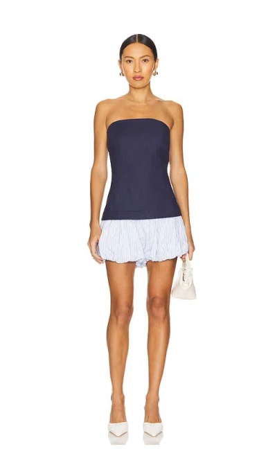 Line & Dot Eline Bubble Romper in Navy. Size L, M, S, XS. Self: 90% linen 10% cotton Lining: 100% cotton Contrast Fabric: 67% cotton 30% nylon 3% spandex. Made in China. Dry clean only. Fully lined. Concealed back zipper with hook and eye closure. Bubble hem. Neckline to hem measures approx 24 in length Leg opening measures approx 22. LEAX-WR55. LR6320Y. Line & Dot is a women's contemporary collection that instantaneously distinguishes itself by combining classic staples and modern European style. Every season, Line & Dot delivers an element of surprise with each style, marrying together with timeless femininity and vintage aesthetic. This creative blend results in a collection of effortless pieces that are perfect for any occasion. Line & Dot embraces all things wearable yet glamorous, creating a chic style that every woman aspires to achieve.