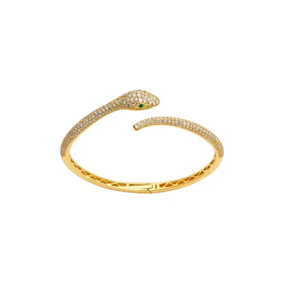 An articulated snake design wraps the wrist with precision. Pavé stones trace the curves, and a single green crystal marks the eye.