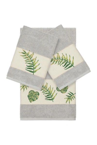 The ZOE Embellished Towel Collection features lush tropical leaves in applique embroidery on a woven textured border. These soft and luxurious towels are made of 100% premium Turkish Cotton and offer lasting absorbency and superior durability. 3-piece set. Color: light grey. ImportedSet includes:. Bath Towel: 27" x 54". Hand Towels: 16" x 30" each