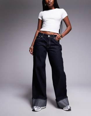 LIQUOR N POKER Cinch Midrise Turn Up Baggy Denim Jeans With Contrast Stiching In Blue