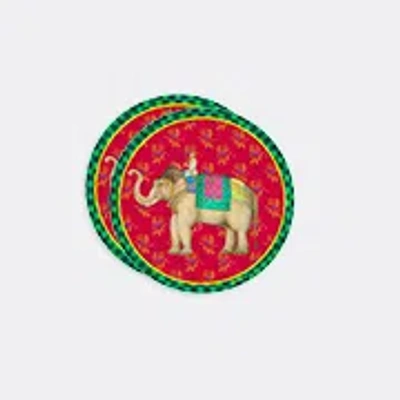 The round 'Elephant Peacock Masonite' placemat in red features a beautifully detailed Indian elephant dressed in textiles from the Lisa Corti collection. A wine red background with purple and gold floral detailing gives way to surprising checkerboard panels in contrasting green and blue. Made in Italy, this set of two heat-resistant, easy-clean placemats brings a far-flung feel to the table. Mix and match with other Lisa Corti tableware for an elegantly maximalist on-brand look.