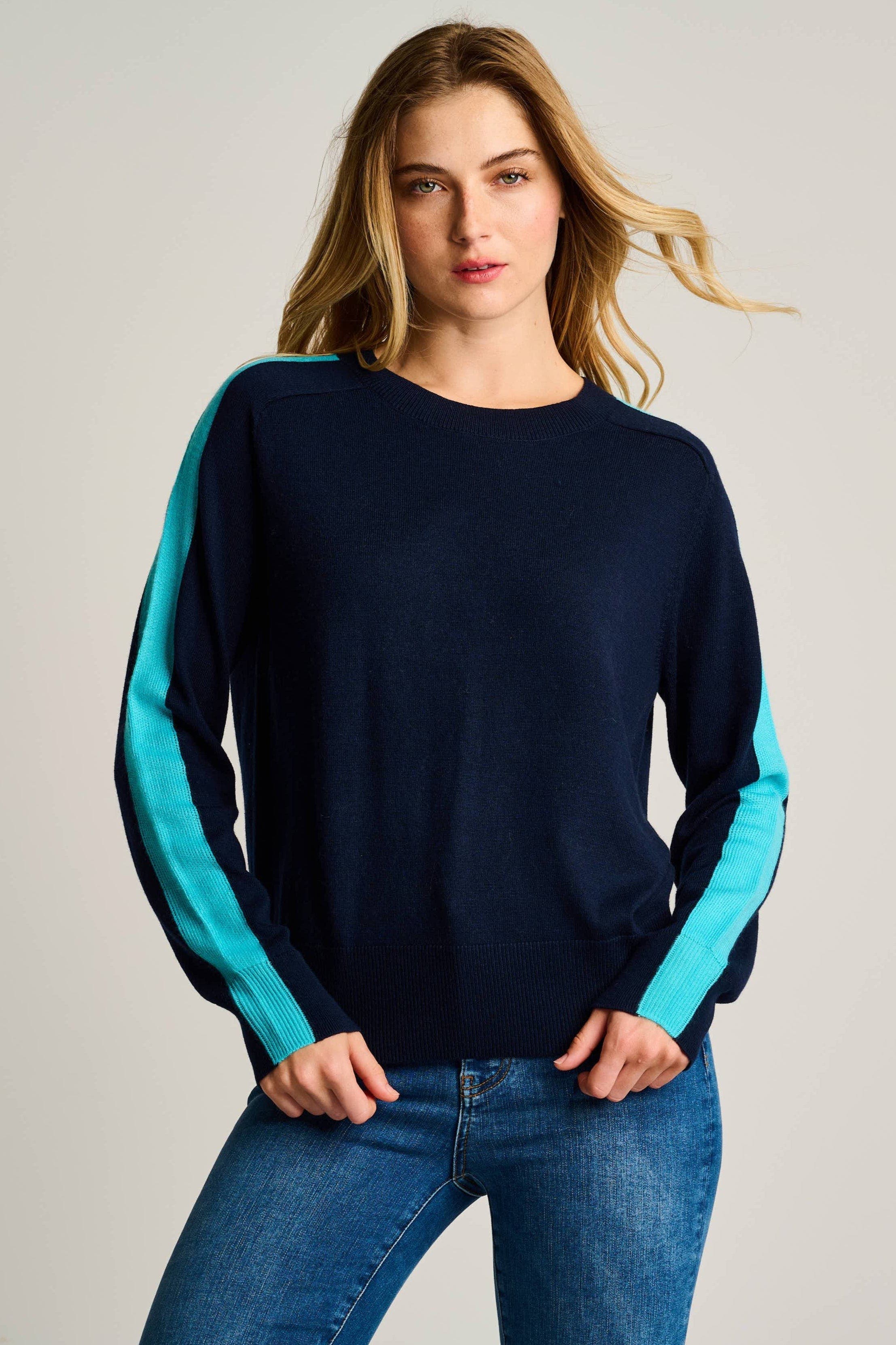 Graphic, clean, and modern, the Stripefull crewneck pullover redefines everyday stripes. Designed with contrast striping down the raglan sleeves and rib trim for structure, it’s equal parts sporty and sophisticated. Lightweight yet substantial, it’s the perfect sweater for layering across seasons. Luxe Cotton blend Relaxed fit Crew neck pullover Contrast stripe down raglan sleeve Rib trim Model is 5’9” and is wearing size small