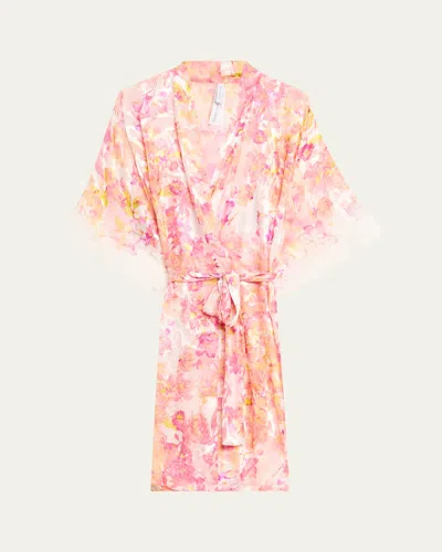 Lise Charmel "Folie D'Ete" floralprint robe crafted in devoré satin with Leavers lace cuffs Surplice neckline; wrap front 3/4 sleeves Waist selftie Hem hits around the knee Aline silhouette Nylon/polyamide/polyester/elastane Made in Bulgaria