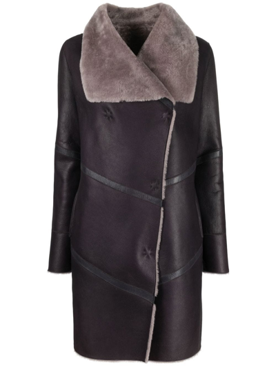 Aubergine purple lambskin shearling-lined leather coat from LISKA featuring tape detailing, off-centre front button fastening, classic hood, shearling lining, two side welt pockets, long sleeves, straight hem and thigh-length. This piece can be styled in multiple ways..
