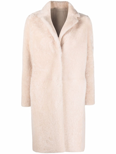 Soft beige lamb fur/lambskin single-breasted textured coat from LISKA featuring textured finish, notched collar, concealed front fastening, long sleeves and two side slit pockets.