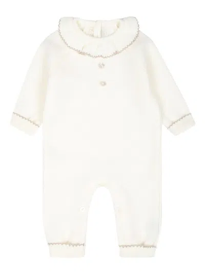 white wool knitted construction button fastening round neck ruffle collar contrast stitching decorative button detailing long sleeves turn-up hem